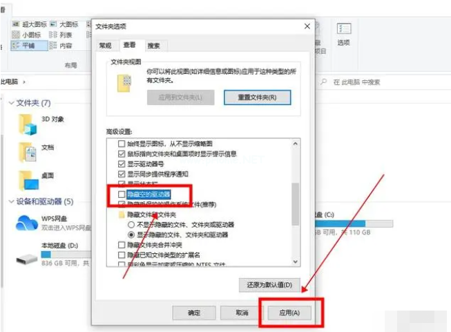 3、在下方的高級(jí)設(shè)置中,取消勾選“隱藏空的驅(qū)動(dòng)器”,點(diǎn)擊“應(yīng)用”即可。