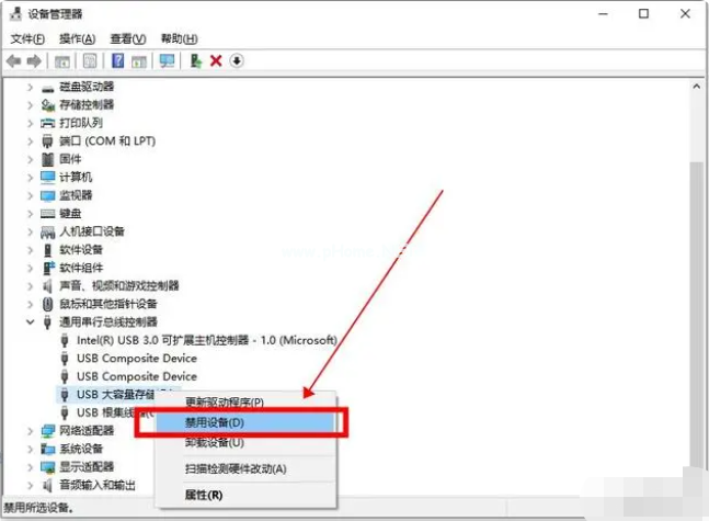 3、下拉選項(xiàng)中有“USB大容量存儲(chǔ)設(shè)備”,選中并右鍵點(diǎn)擊“禁用設(shè)備”即可。