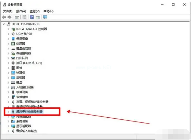 2、進(jìn)入設(shè)備管理器窗口,找到并點(diǎn)擊“通用串行總線控制器”。
