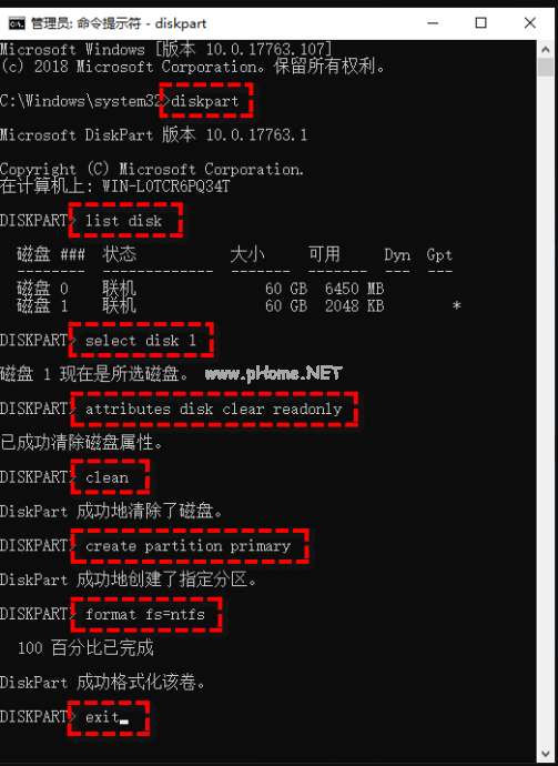 format fs=ntfs(如果您想將其格式化為FAT32文件系統(tǒng)則輸入format fs=fat32)