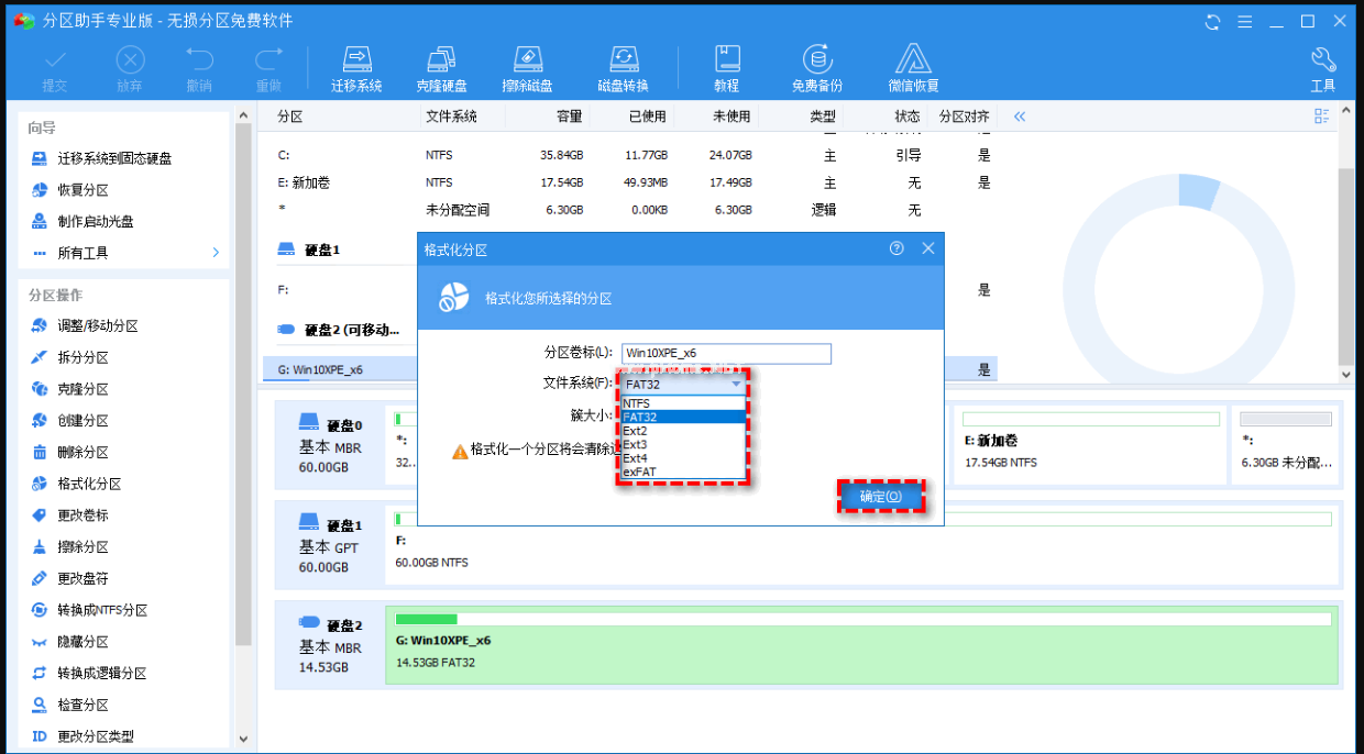 2. 在彈出窗口中為其選擇一個合適的文件系統(tǒng)(您也可以為其設(shè)置分區(qū)卷標(biāo)與簇大小),然后單擊“確定”。