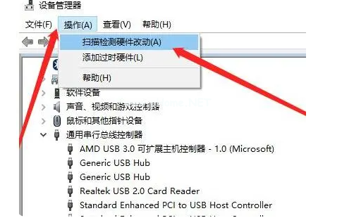 6、這樣我們點(diǎn)擊“操作”,彈出“掃描檢測(cè)硬件更改”;