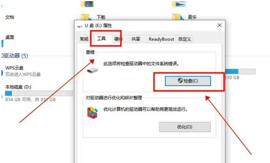2、進入U盤屬性中,選中工具選項卡,點擊其中的“檢查”按鈕;
