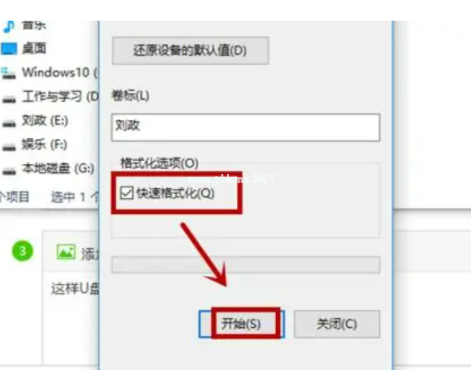2、在彈出的窗口中,勾選“快速格式化”,點擊開始;