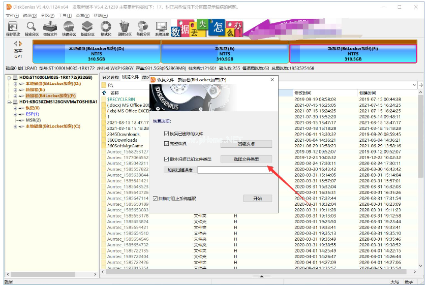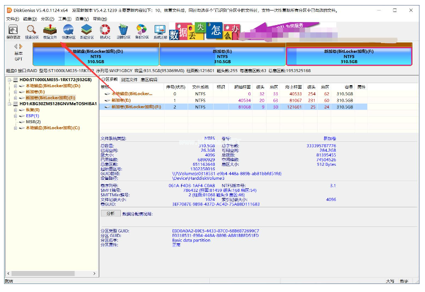 1、首先打開(kāi)Diskgenius軟件,選擇左側(cè)的磁盤,點(diǎn)擊“恢復(fù)文件”功能。