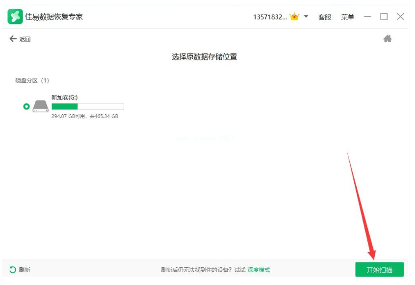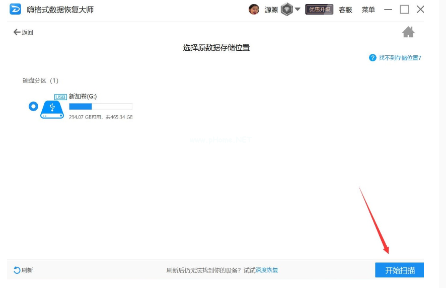 2、然后選擇原文件的存儲(chǔ)位置,選好點(diǎn)擊“開(kāi)始掃描”。