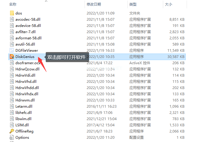 1.運(yùn)行DiskGenius軟件,在DiskGenius官方網(wǎng)站下載最新版的軟件,下載后無需安,解壓縮一下就可以運(yùn)行軟件了,如下圖所示,雙擊DiskGenius就可以打開軟件。