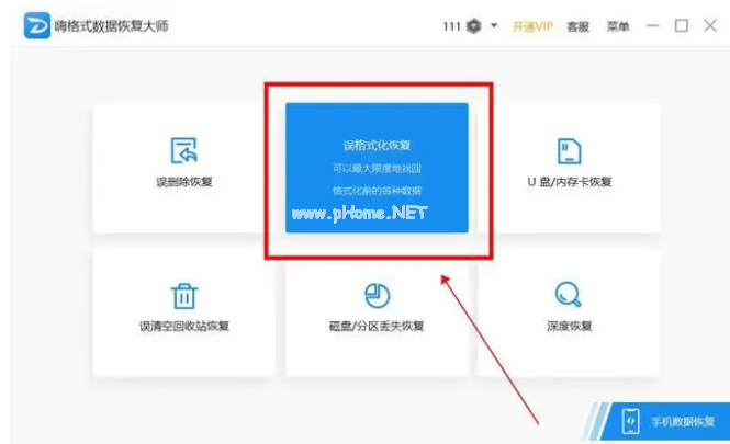 1.運(yùn)行電腦上安裝好的【嗨格式數(shù)據(jù)恢復(fù)大師】軟件,軟件主頁上有六個恢復(fù)模式,這里需要點(diǎn)擊“誤格式化恢復(fù)”模式。