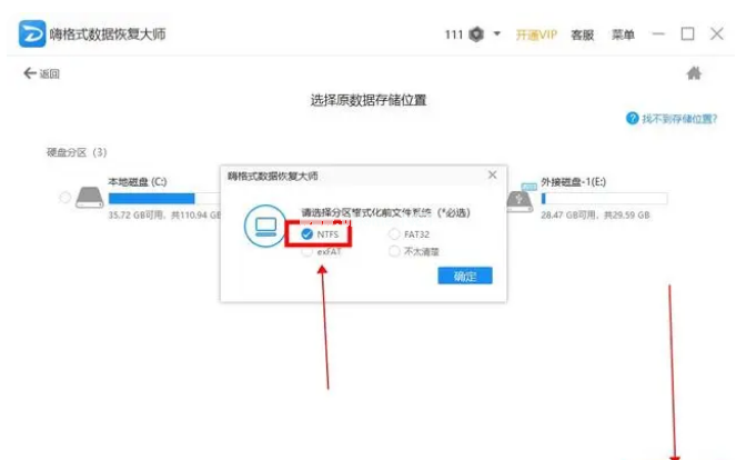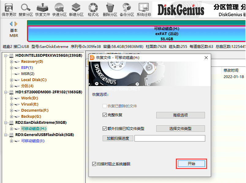 3.在彈出窗口中點(diǎn)擊分區(qū)格式化前的文件系統(tǒng)并確定,選擇好后點(diǎn)擊“開始掃描”。