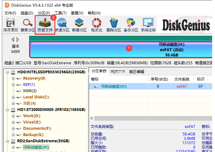 2.在DiskGenius軟件中選擇需要恢復(fù)數(shù)據(jù)的U盤,并點(diǎn)擊左上方的“恢復(fù)文件”按鈕。