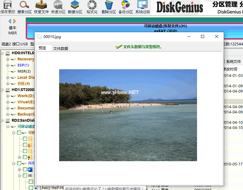 4.預(yù)覽數(shù)據(jù),看到軟件列出數(shù)據(jù)后,就可以進(jìn)行預(yù)覽了:在軟件左側(cè)點(diǎn)擊某個文件夾,在軟件右側(cè)會顯示文件夾中的數(shù)據(jù),如果雙擊某個文件,軟件會彈出一個預(yù)覽窗口顯示文件內(nèi)容,例如下圖,正在預(yù)覽圖片文件。