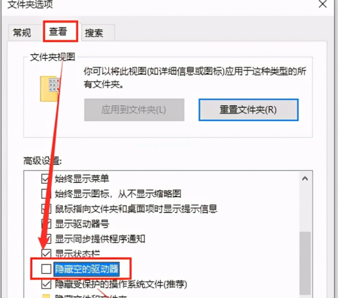 2、接著在文件夾選項界面,點擊「查看」,取消勾選「隱藏空的驅動器」這個選項,最后點擊「應用」。