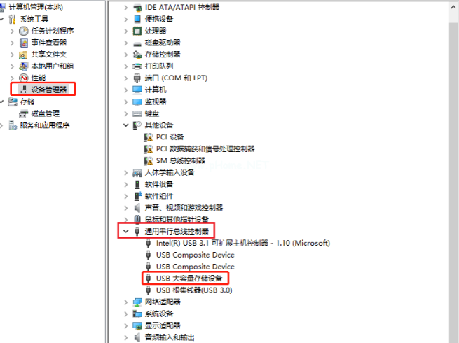 7、 依舊是先進入到「計算機管理」界面,點擊「設備管理器」,找到「通用串行總線控制器」,雙擊「USB大容量存儲設備」。