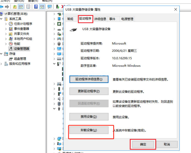 8、 接著在彈出的窗口中,點擊「驅動程序」-「卸載設備」-「確定」,卸載完成之后,再將U盤重新插入電腦,系統(tǒng)會自動加載U盤驅動,最后檢查一下U盤是否被讀取。