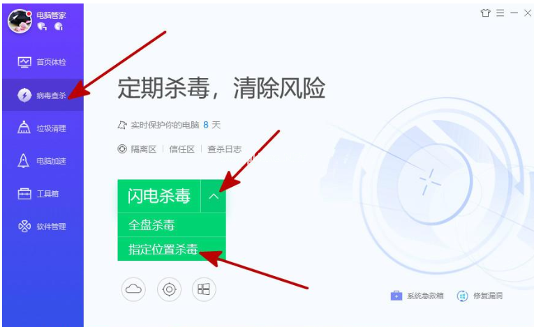 7、直接打開“騰訊電腦管家”,依次選擇圖中箭頭處的“病毒查殺”、“向下的箭頭↓”、“指定位置殺毒”。