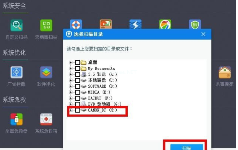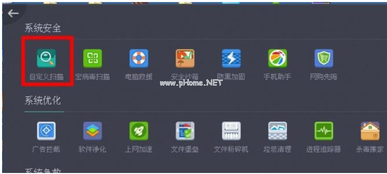 6、點擊自定義掃描按鍵,進到到自定義掃描界面。
