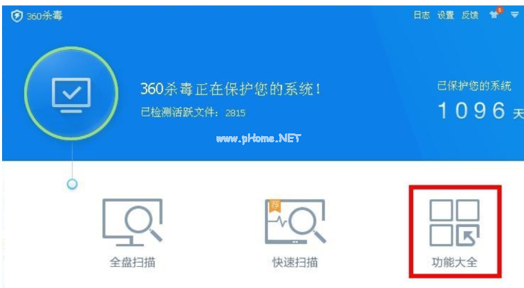 5、假如插入U盤后并沒有自動彈出U盤小助手,那么就直接打開360殺毒,點擊功能大全按鍵。