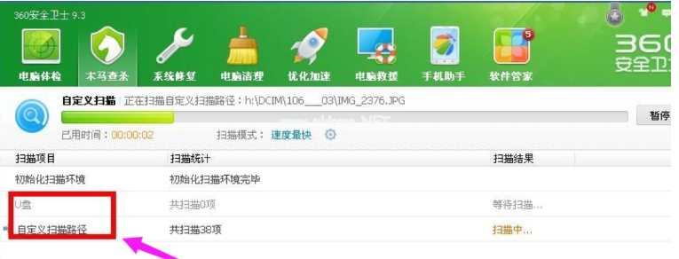 3、360殺毒會自動啟動并開始對U盤全方位掃描了。