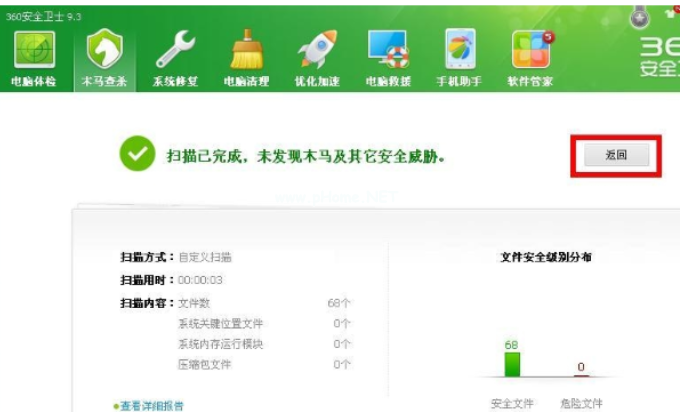 4、等候掃描詳細介紹,假如有病毒感染,會出現(xiàn)清晰病毒感染的選項,要是沒有,會告之U盤是安全的并發(fā)生返回選項。