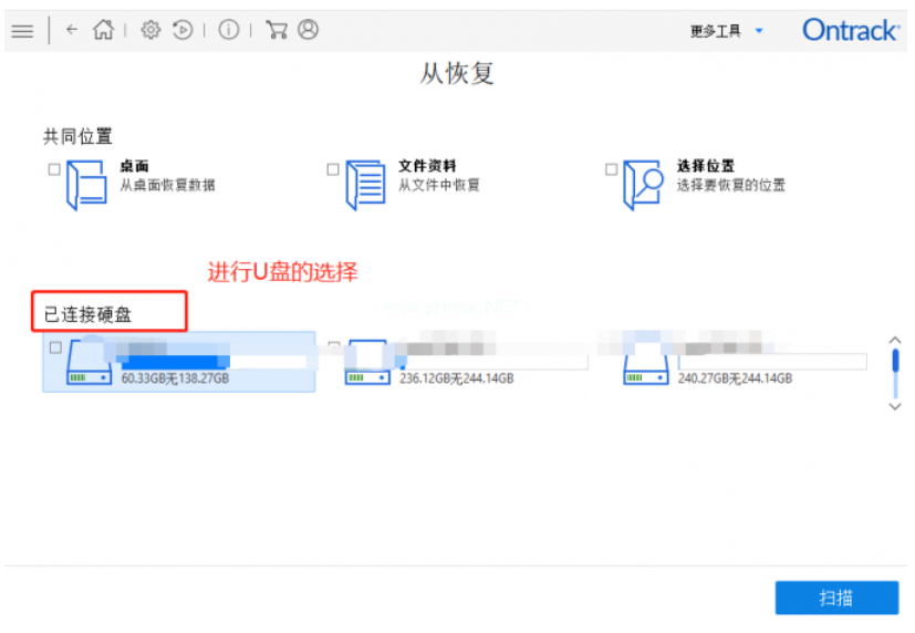 2.接下來(lái)就是要選擇丟失文件的位置,可以直接選擇已經(jīng)連接好的U盤,進(jìn)行“掃描”。?