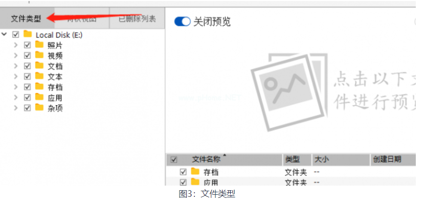 3.點(diǎn)擊掃描之后,軟件會(huì)對(duì)U盤進(jìn)行徹底掃描,等待掃描介紹之后,會(huì)將所有掃描出來(lái)的文件列出來(lái),點(diǎn)擊“文件類型”即可查看按照數(shù)據(jù)類別顯示的所有數(shù)據(jù)。