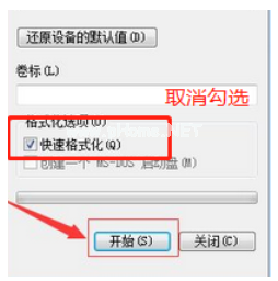 2.然后在彈出來(lái)的界面,取消勾選——快速格式化選項(xiàng),然后進(jìn)行——開(kāi)始