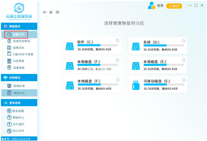 1、首先下載安裝云騎士數(shù)據(jù)恢復(fù)軟件,打開軟件操作界面以后,根據(jù)數(shù)據(jù)丟失情況,選擇一個合適的模式進行恢復(fù),這里選擇情景模式中的誤刪文件。