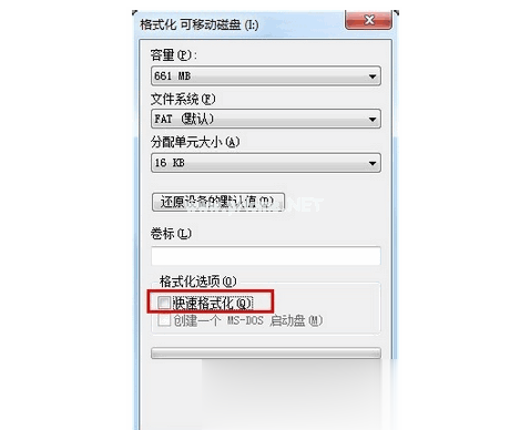 3.當(dāng)以上方法無法打開U盤時(shí),建議對U盤進(jìn)行格式化操作。右擊“可移動磁盤”,在彈出的右鍵菜單中選擇“格式化”項(xiàng)。在打開的“格式化”窗口中,取消勾選“快速格式化”并點(diǎn)擊“開始”按鈕。