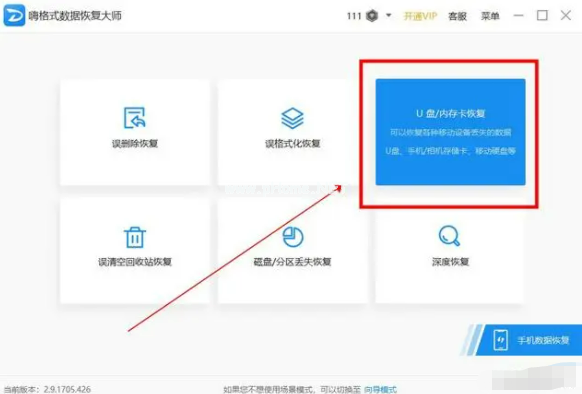 步驟1:點(diǎn)擊打開數(shù)據(jù)恢復(fù)軟件,我這里選擇以【嗨格式數(shù)據(jù)恢復(fù)大師】為例,在軟件的主界面中,鼠標(biāo)點(diǎn)擊“U盤/內(nèi)存卡恢復(fù)”模式;