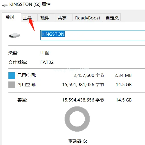 3、在U盤(pán)磁盤(pán)屬性窗口上方點(diǎn)擊“工具”。