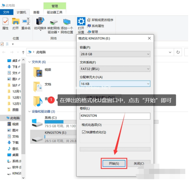 2、在彈出的U盤格式化窗口,選中【快速格式化】,點擊【開始】。格式化結(jié)束,U盤里面的病毒也被清理好了。