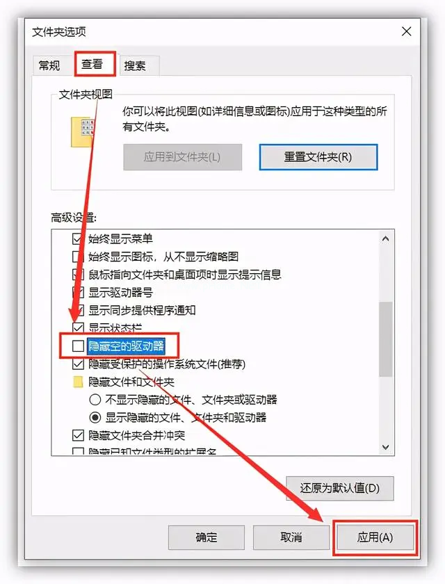 2、打開(kāi)文件夾選項(xiàng)界面后,點(diǎn)擊切換查看選項(xiàng)卡,取消勾選“隱藏空的驅(qū)動(dòng)器”,點(diǎn)擊“應(yīng)用”。