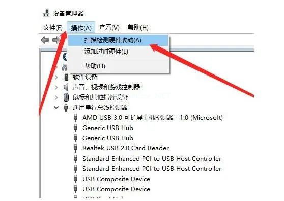 5、再點(diǎn)擊“操作”-“掃描檢測(cè)硬件改動(dòng)”。