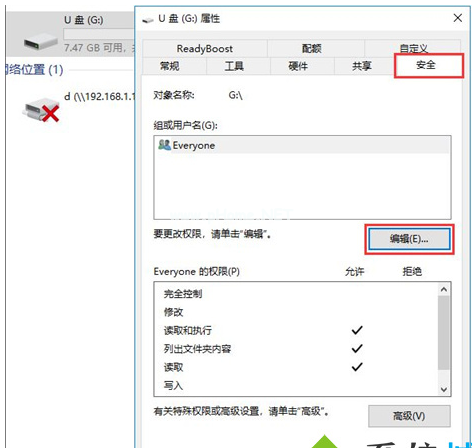 2、在屬性窗口界面上方找到并點擊安全,在安全選項卡中部找到并點擊編輯。