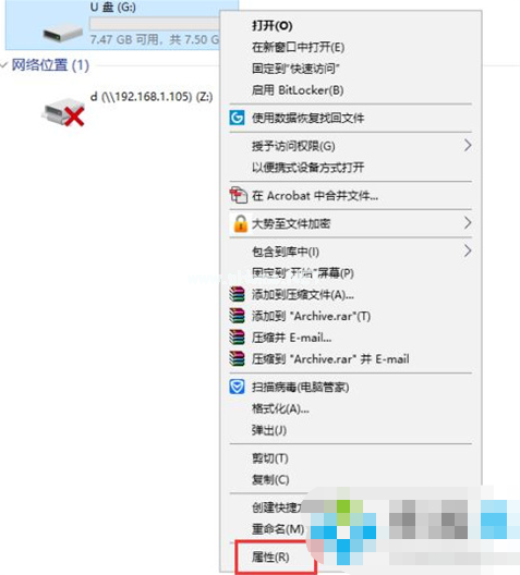 1、在U盤盤符的上方點擊鼠標(biāo)右鍵,在彈出的菜單中點擊屬性。