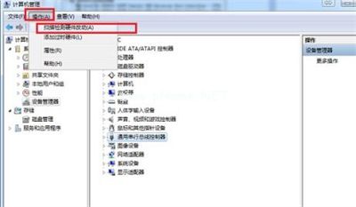 5、點擊操作->掃描檢測硬件改動,這時將會自動重新安裝這些usb驅(qū)動。