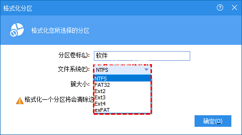 4. 點(diǎn)擊格式化后會(huì)彈出以下界面,選擇我們本次需要的文件系統(tǒng)后點(diǎn)擊確定,U盤(pán)將開(kāi)始進(jìn)行格式化操作。