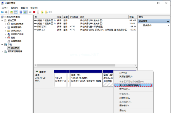3. 選中我們需要添加盤(pán)符的的活動(dòng)分區(qū),選擇更改驅(qū)動(dòng)器號(hào)和路徑。