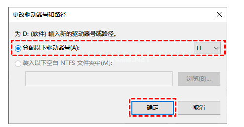 5. 點(diǎn)擊分配以下驅(qū)動(dòng)號(hào)后面的框,選擇一個(gè)電腦其他硬盤(pán)或者磁盤(pán)沒(méi)有被使用過(guò)的盤(pán)符,比如H盤(pán),點(diǎn)擊確定。