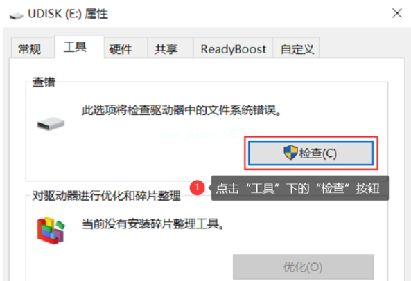 2、在打開的窗口,切換到工具界面,鼠標(biāo)點擊【檢查】。再選擇掃描并修復(fù)驅(qū)動器即可。