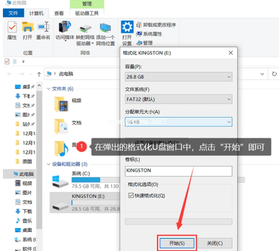 2、在彈出的U盤格式化窗口界面,選中【快速格式化】,點擊【開始】。格式化結(jié)束,U盤里面的病毒也被清理好了。