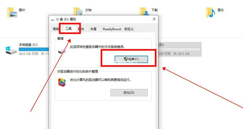 ?2、選擇工具點(diǎn)擊檢查在U盤(pán)屬性中選擇“工具”,點(diǎn)擊“檢查”按鈕。