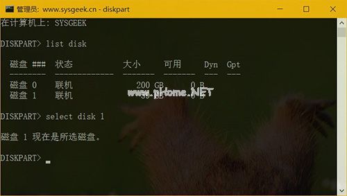 4、使用 select 命令選中U 盤,在演示環(huán)境中 U 盤是磁盤 1,所以使用 select disk 1 命令將它選中。注意:不論 Linux 還是 Windows 系統(tǒng),硬件都是從 0 開始標(biāo)識的,所以千萬別選錯了。