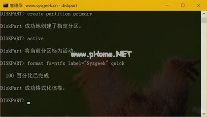 6、使用如下命令創(chuàng)建一個新的主分區(qū)并標(biāo)記不活動分區(qū):create partition primary和active,之所以標(biāo)記為活動分區(qū),是為了方便將 Windows 系統(tǒng) ISO 映像放上去當(dāng)啟用 U 盤來用。