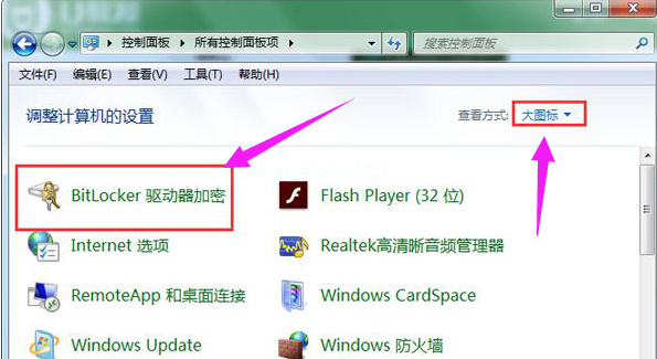 1、首先打開(kāi)控制面板,修改查看方式為大圖標(biāo),點(diǎn)擊“bitlocker驅(qū)動(dòng)器加密”選項(xiàng)。