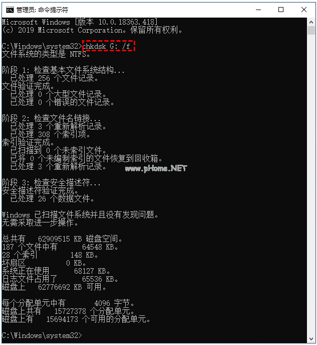 2、依次輸入以下命令:輸入chkdsk G: /f并按回車。(字母G為U盤的驅(qū)動器號,根據(jù)具體情況修改。)此命令可以修復(fù)損壞或無法召喚的U盤。