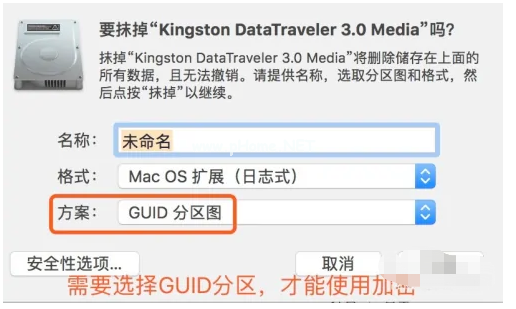 4.點按抹掉,選擇GUID分區(qū)圖,mac OS擴展(日志式 加密)格式化U盤。