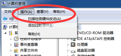 5、接著點(diǎn)擊“操作”菜單,從彈出的下拉菜單中選擇“掃描檢測(cè)軟件更動(dòng)”項(xiàng),以自動(dòng)掃描并識(shí)別U盤并安裝驅(qū)動(dòng)程序。