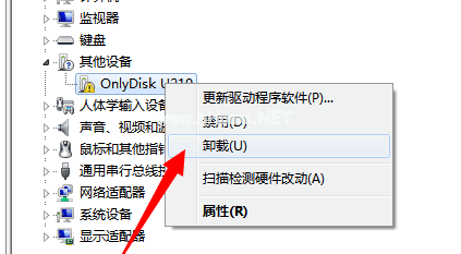 4、如果不行,我們還可以右擊無法正常識(shí)別的U盤,從其右鍵菜單中選擇“卸載”項(xiàng),將之前的U盤驅(qū)動(dòng)卸載掉。