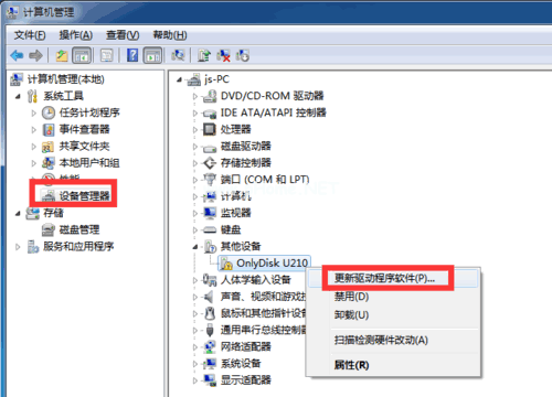 2、從打開的“計(jì)算機(jī)管理”窗口中,展開“設(shè)設(shè)備管理器”,找到未正常識(shí)別的U盤標(biāo)識(shí),右擊選擇“更新驅(qū)動(dòng)程序軟件”項(xiàng)。